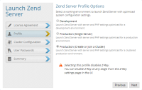 - Select the server profile that best suits your working environment. Your selection determines the default system settings that Zend Server launches with:
