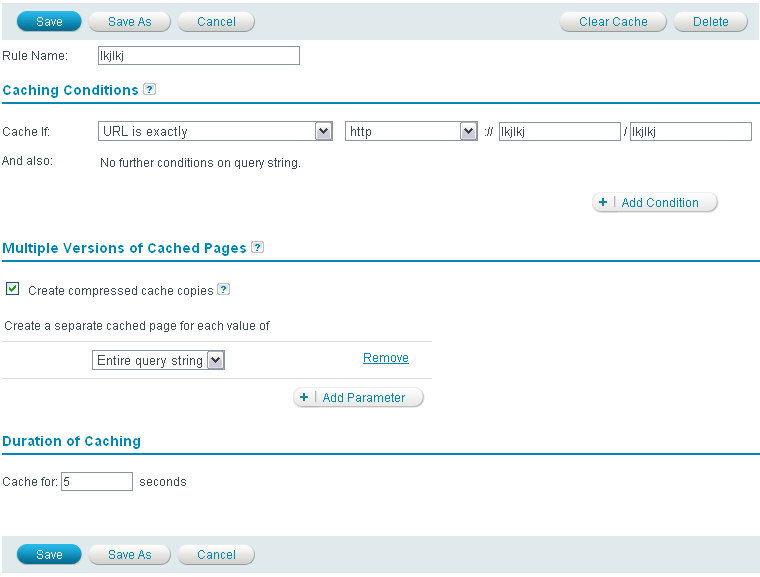 You can also add conditions that can further pinpoint what to cache. You can choose to cache when "all of the following are true" - i.e. all the conditions occur or when "at least one is true" - i.e. trigger caching when at least one of the conditions occur.