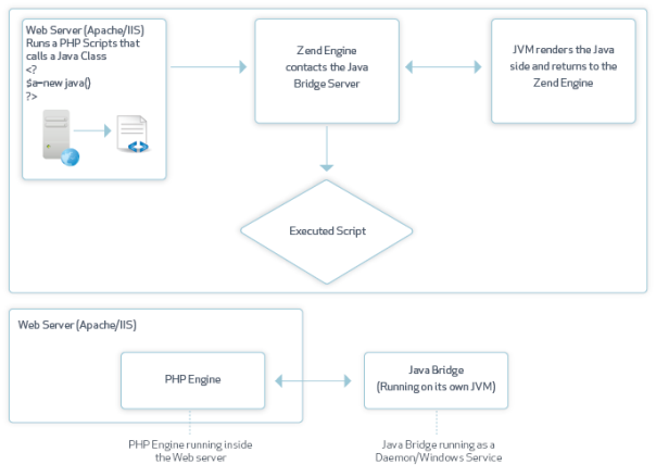 The Java Bridge PHP extension adds functions that allow you to instantiate new Java classes from inside your PHP script. Once a Java class is instantiated, the Java Bridge gets a message from the Zend Engine to execute the Java code. The Java Bridge executes the script and returns the results to the Zend Engine.
