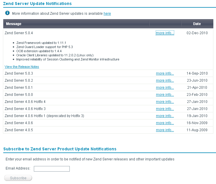 If you would like to be notified of Zend Server updates, enter your email address in the Subscribe to Zend Server Product Update Notifications area and click Subscribe.