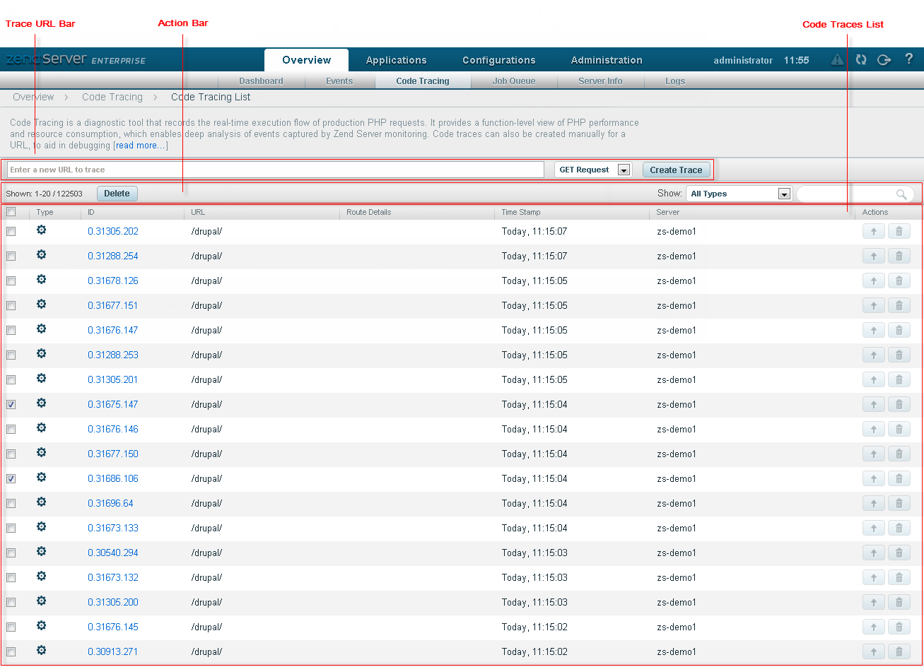 The Code Tracing page is accessed from Overview | Code Tracing, and is the central display and management area for all traced information.