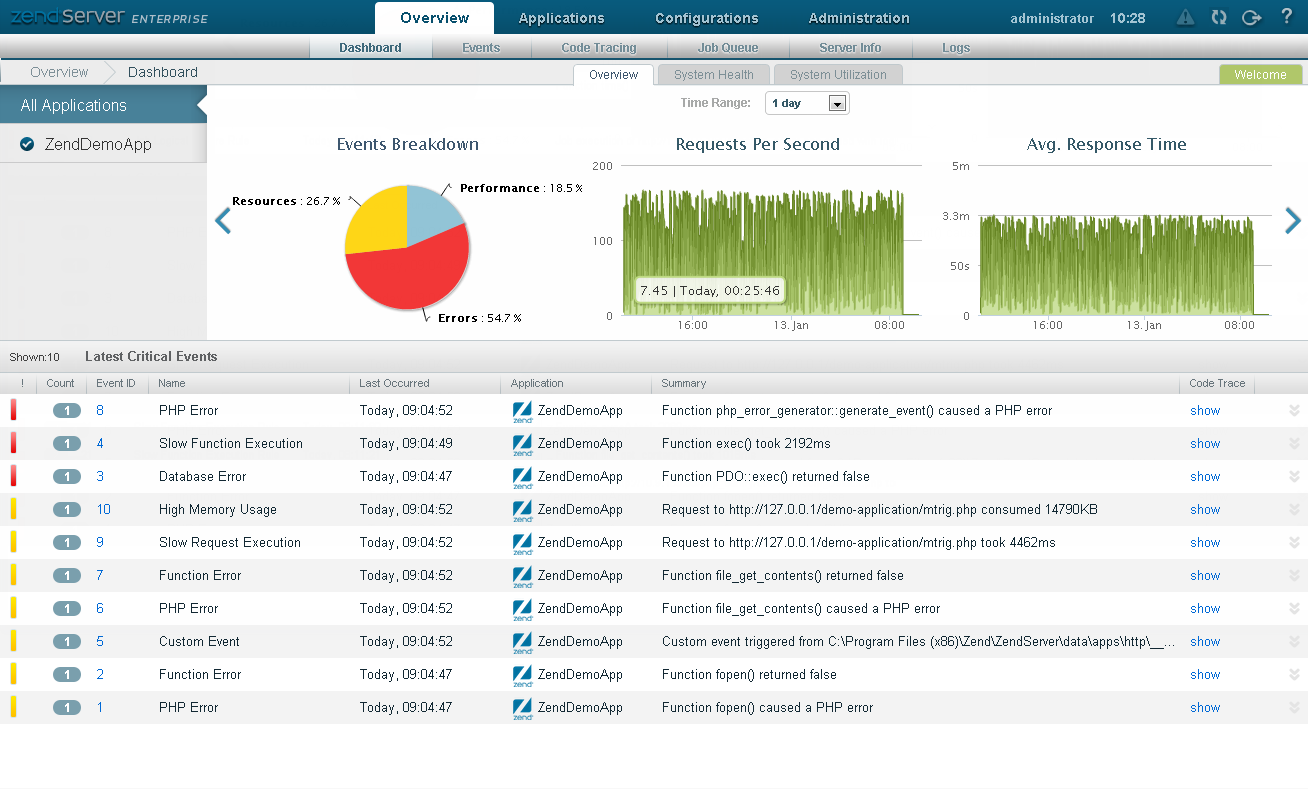 Zend Server's UI has been designed to enable you to interact more naturally with Zend Server and is centered around your applications, making it easier for you to manage, monitor and develop your applications in a seamless process. The UI displays statistical graphs per application, allows you to manage and configure rules per application, and also provides a way to integrate existing applications into the Zend Server management system.