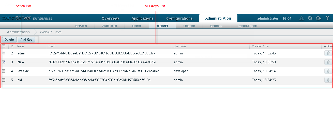 The WebAPI Key grants access to your server, and is necessary for accessing and using Zend Server's API. API Keys are user-bound, and can only be used by their designated user-role.