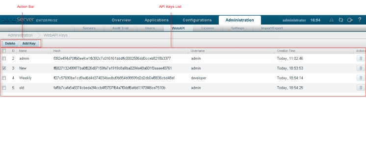 The WebAPI page is accessed from Administration | WebAPI, and is used to display and manage API Keys.
