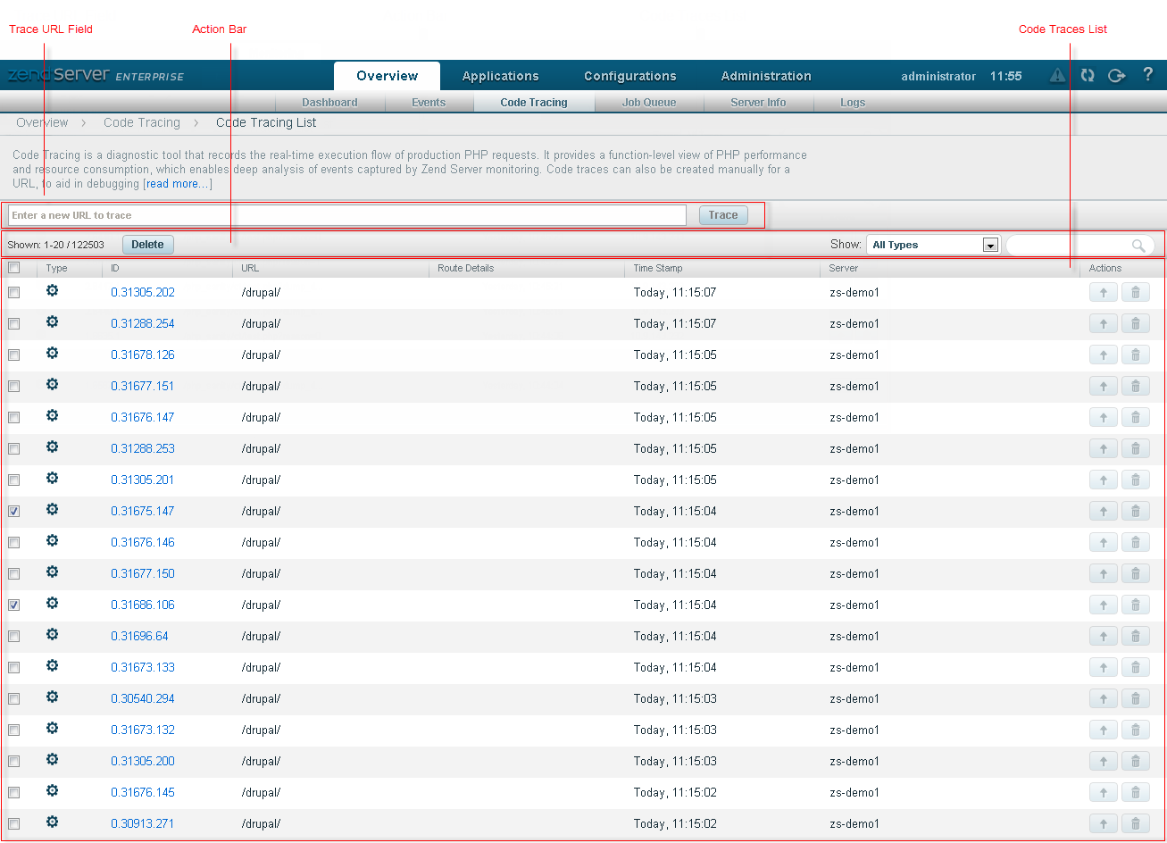 The Code Tracing page is accessed from Overview | Code Tracing, and is the central display and management area for all traced information.