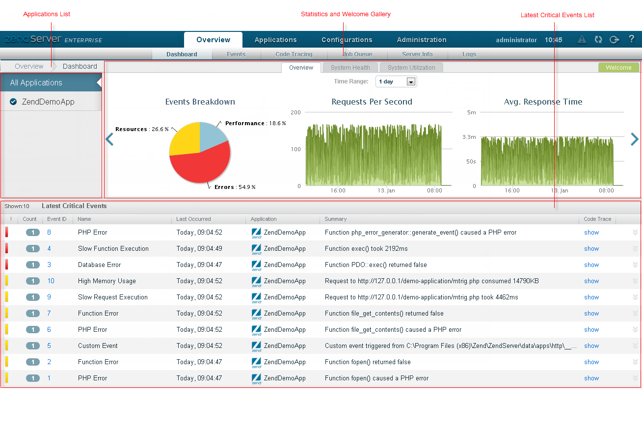 The Dashboard page is accessed from Overview | Dashboard and is the default page that is displayed after logging in to the Zend Server UI. The Dashboard page provides you with a general system overview, containing application-specific analytic information indicating how your applications are performing in relation to expected behavior. You can use this page to quickly get started with your applications.
