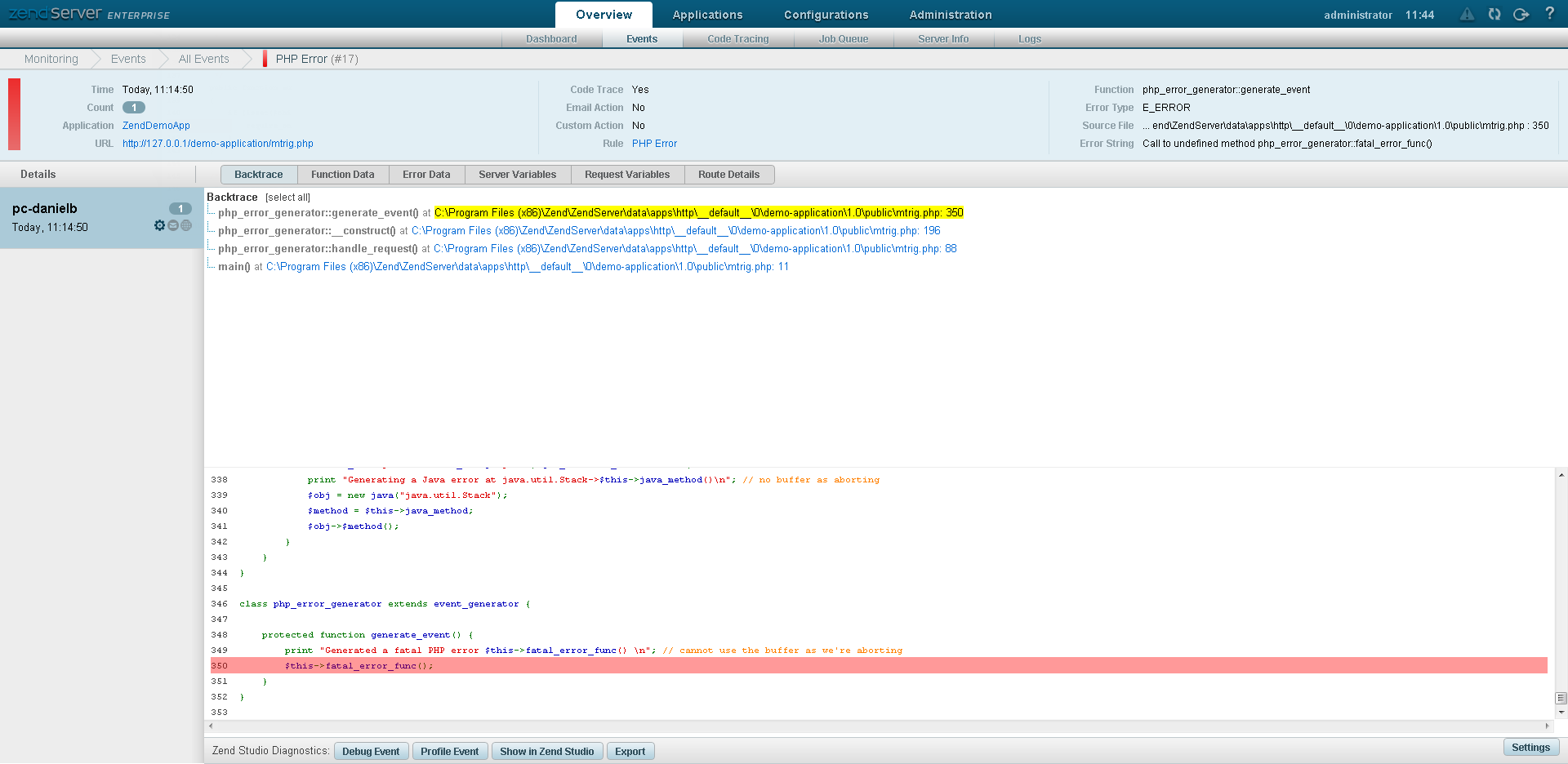 This procedure describes how to debug an event from inside Zend Server using Zend Studio. Debugging from inside an event provides an additional diagnostics layer in order to investigate why a specific event was triggered.