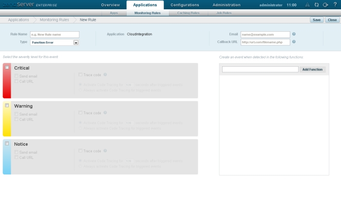 The following procedures explain how to add, create, edit , remove and export monitoring rules. Zend Server Monitoring is based on a set of predefined rules that can be configured to suit your environment's requirements (such as performance thresholds) or enabled and disabled as necessary. Once Zend Server is installed, the Monitor component begins to create Events based on these rules.