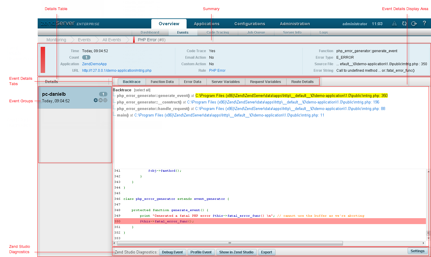 The Event Details page is accessed from the Events page or the Dashboard page by selecting an event ID from the Events list , or by clicking More Details in an event's expanded view. The page contains all the available monitored event-related information and details, and Zend Studio diagnostic tools.