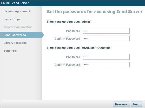 - Configure the passwords for accessing the Zend Server UI. Passwords must be between 4 - 20 characters long and can be changed at a later stage from within the product.