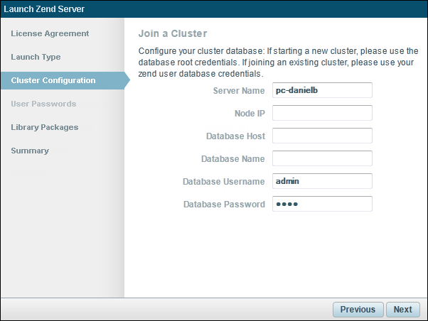 Enter the details of the server and cluster database, and click Next. According to the details entered, the wizard identifies whether you are the first member of the cluster, or an additional member to a pre-existing cluster, and displays the next dialog accordingly. If this is the first server in the cluster, the User Passwords dialog is displayed. If not, the Summary dialog is displayed - skip to step 7.