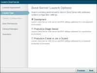 - Production (Create or Join a Cluster) - Launch Zend Server with server and PHP settings optimized for clustered production environment.