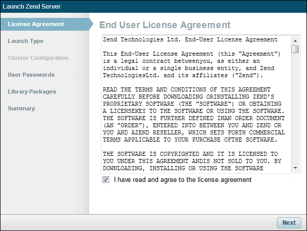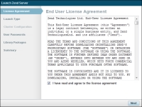 - The first time Zend Server runs after installation, the Launch Zend Server wizard is opened with the License Agreement dialog displayed.