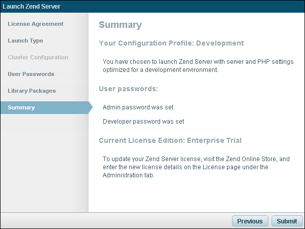 The Launch wizard is designed to quickly get your Zend Server up and running with an optimized working environment that includes system configuration settings that are suited to your personal requirements.