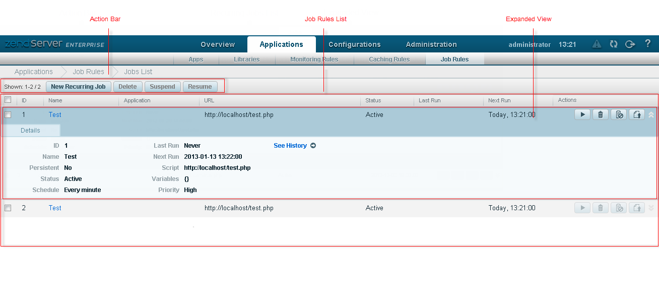 The Job Rules page is the central area for configuring jobs to run by URL. Running jobs by URL makes it easy to eliminate situations where the same file is run in multiple instances, such as off-loading tasks from the synchronous user request to an external, parallel PHP process.