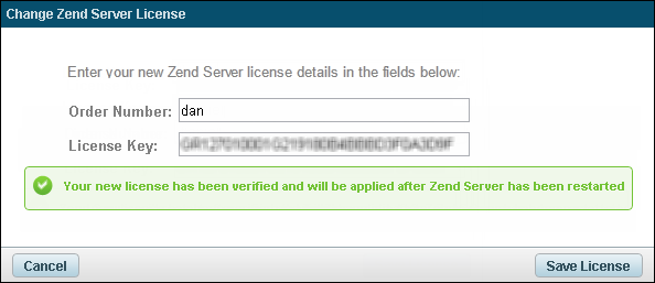 Note: The verification message varies according to the current license you are using, and the license details entered in the Change Zend Server License dialog.