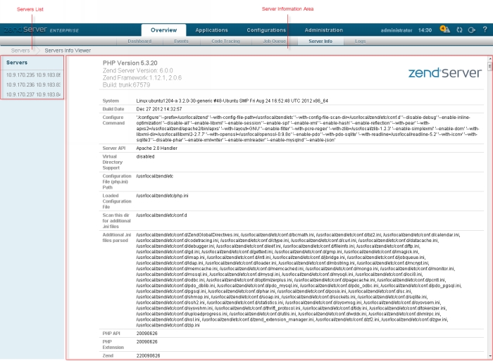The Server Info page is accessed from Overview | Server Info, and is a read-only page that outputs a large amount of information about the current state of your server and PHP environment. It is an easily accessible representation of information contained in the php.ini file, including information about installed Zend Components, PHP compilation options and extensions, the PHP version, server information and environment, PHP environment, OS version information, paths, master and local values of configuration options, HTTP headers and the PHP License.