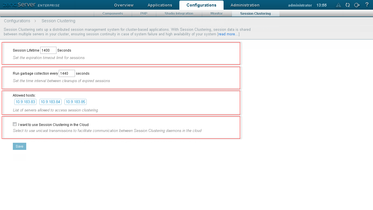 The Session Clustering page is accessed from Configurations | Session Clustering, and contains configuration settings for the Zend Session Clustering component.