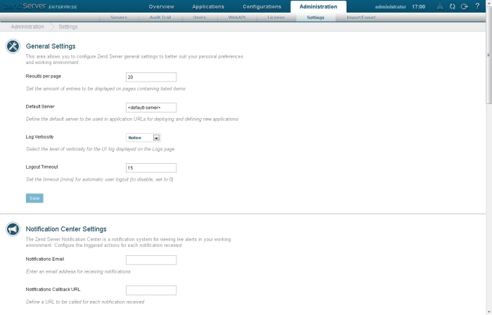 The Settings page is accessed from Administration | Settings, and is used to configure Zend Server system and feature settings.