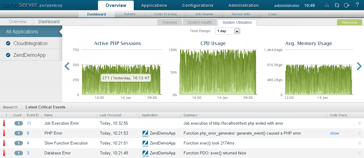 The Zend Statistics component is an additional monitoring tool that collects and displays important statistical data in the UI, enabling you to closely keep track on how your deployed applications and servers are performing. This information is collected by the various Zend Server components, and reflected in a series of metrics displayed in graphical charts on the Overview | Dashboard page.