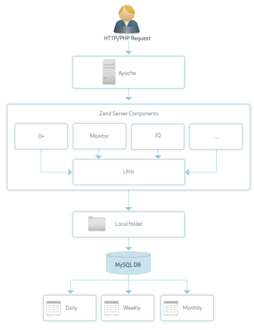 The Zend Server components are responsible for reporting and gathering the data displayed in the UI. The data is aggregated by the components and placed on your disk in the form of binary files. The data is then gathered by the zdd (Zend deployment daemon) and converted into entries in three tables on the your server's MySQL database. These tables represent the time resolution in which the data is stored (daily, weekly and monthly). Outdated data (For example, data older than a month for the monthly table) is deleted and replaced by newly aggregated data.