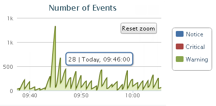 Hover over segment displays details (number of events, time stamp). Select a segment of the graph to zoom in. Filter by time range. Expand chart. |