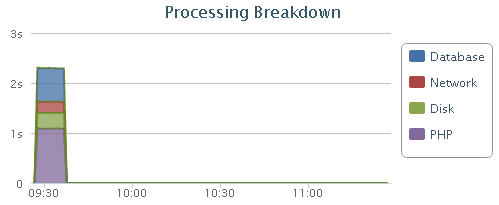 Average amount of time for processing requests by type of component (Database, Network, Disk, PHP). |