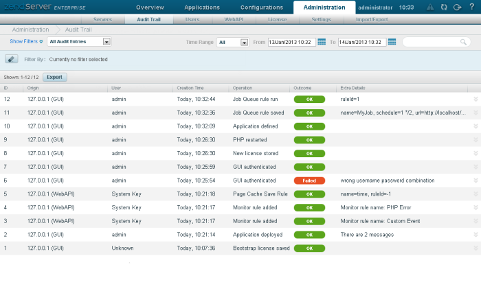 Zend Server 's Audit Trail feature is a simple yet effective method for tracking UI/API user activity, and is especially useful in large-scaled and distributed enterprises. Any time a user performs a significant activity, a record indicating what happened and when it happened is audited and logged by Zend Server. An example for such an activity would be a user deploying an application (for a full list of audited activities , see Audited Actions). The audit log will display information on this activity, such as the name of the user deploying the application and the outcome of the deployment process.