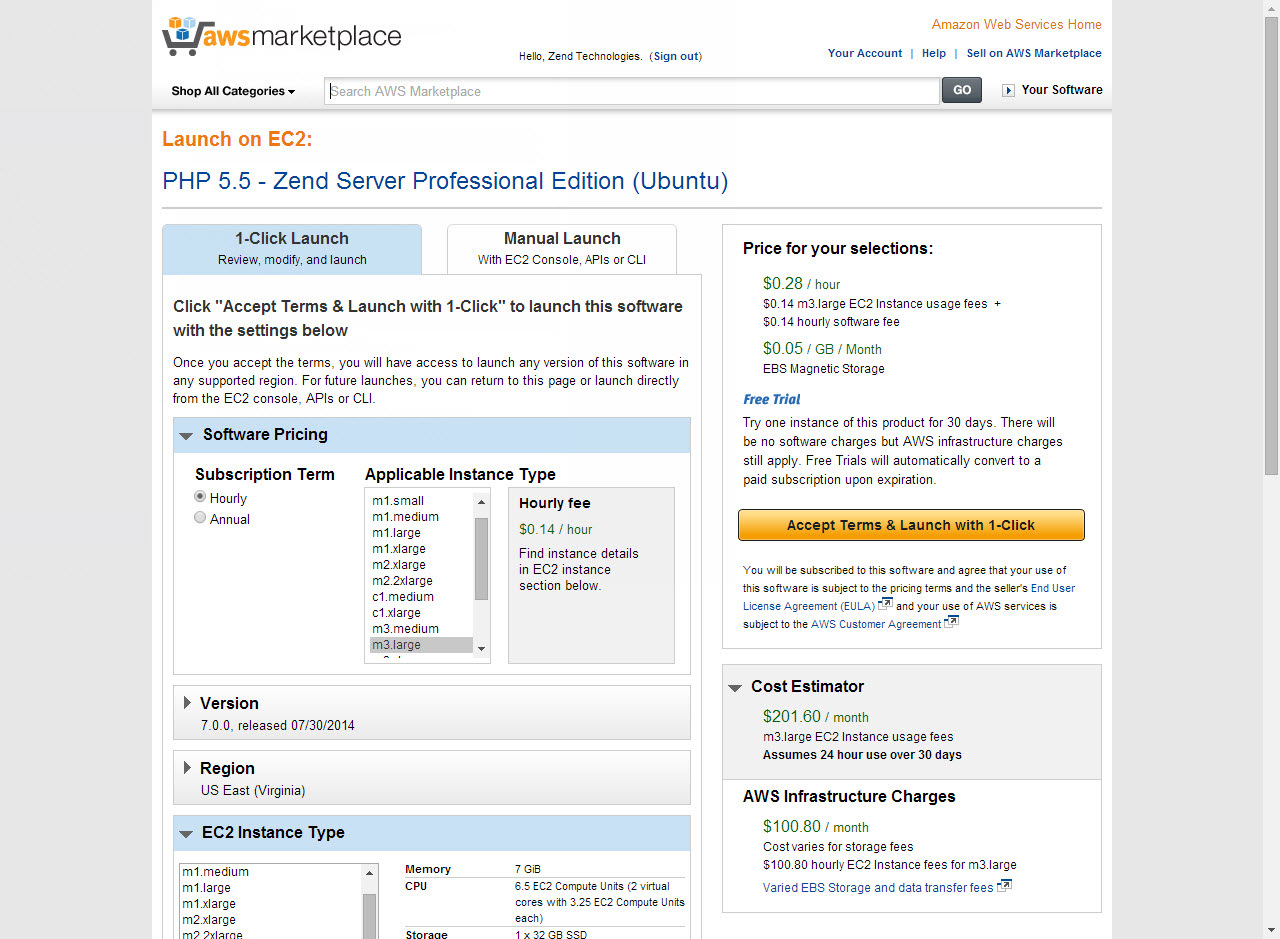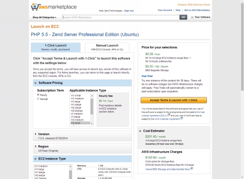 The first step is to select which type of Zend Server machine image you wish to launch, and configure it to best suit your personal preferences.