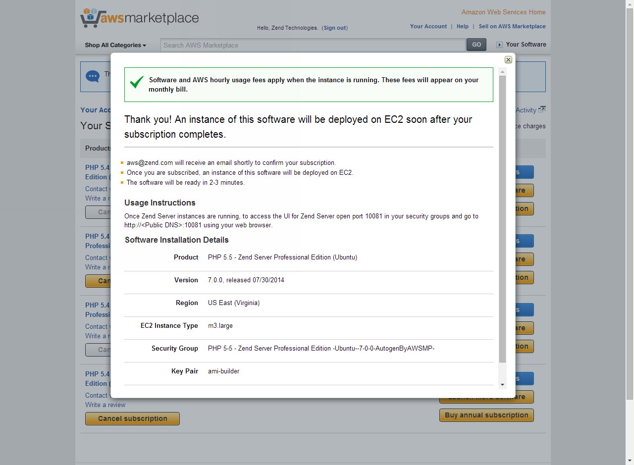 You have successfully deployed and launched a single Zend Server on AWS. Note: To remove the Zend Server AMI, right-click it in the Instances list and select Terminate. Please note, that once terminated, your Zend Server instance cannot be recovered. |