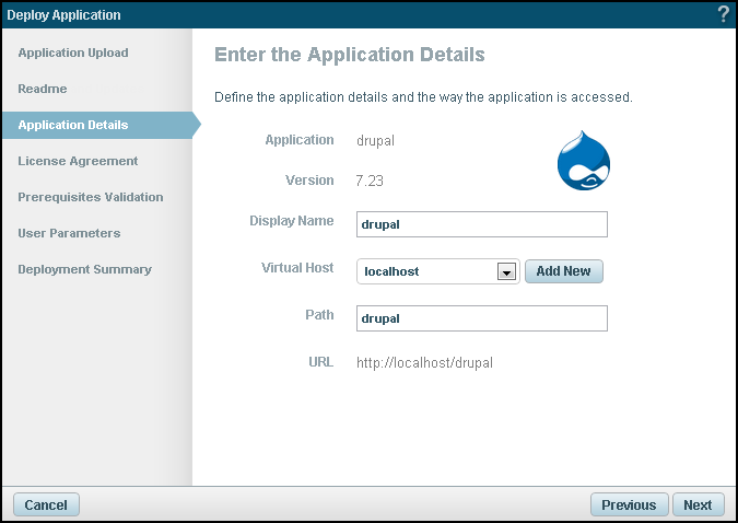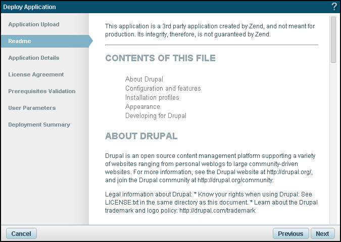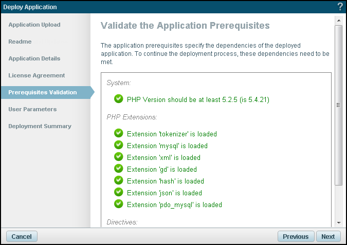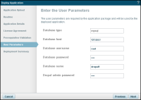 The uploaded package determines which of the wizard dialogs are enabled. Deployment steps that were not defined in the application's XML descriptor file will be ignored by the wizard.