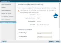 1. The Deployment Summary dialog displays the details of the application to be deployed and a summary of the parameters you have defined for the application.