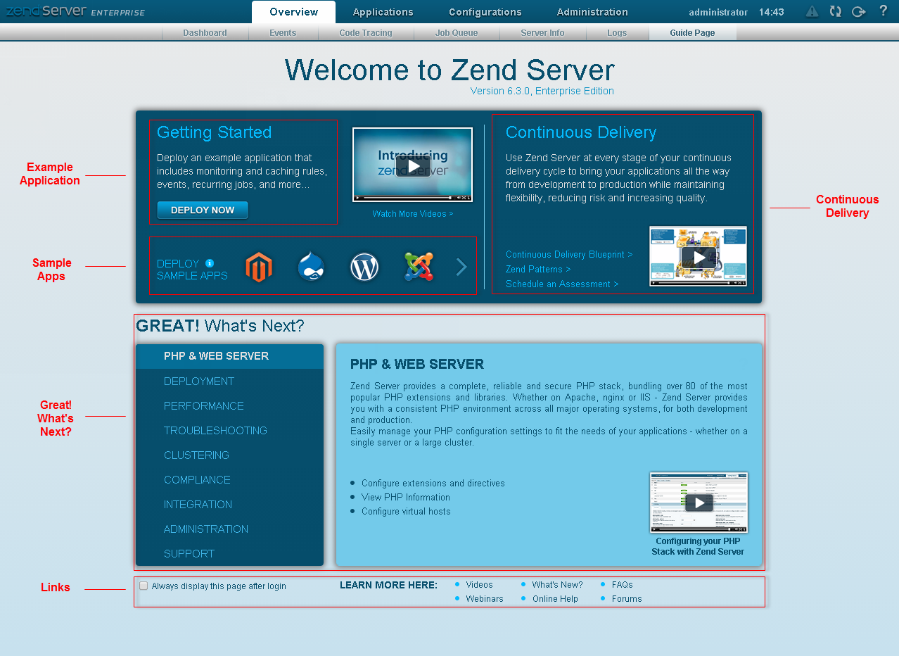 The Guide Page helps users, both first-timers and those already acquainted with Zend Server, to understand the full range of Zend Server's capabilities.