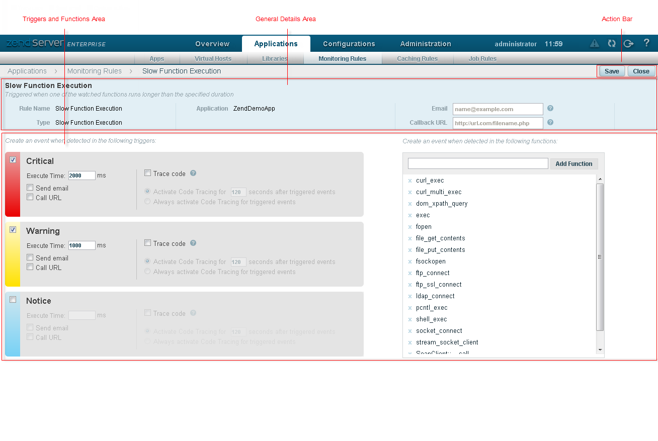 The rule triggers are displayed in containers listed according to their severity level (Critical, Warning, Notice). The containers hold the trigger attributes (e.g., Memory Usage) and thresholds (e.g., 8192), and a list of triggered actions (Trace Code, Send email, Custom actions) to be executed when the event is triggered.