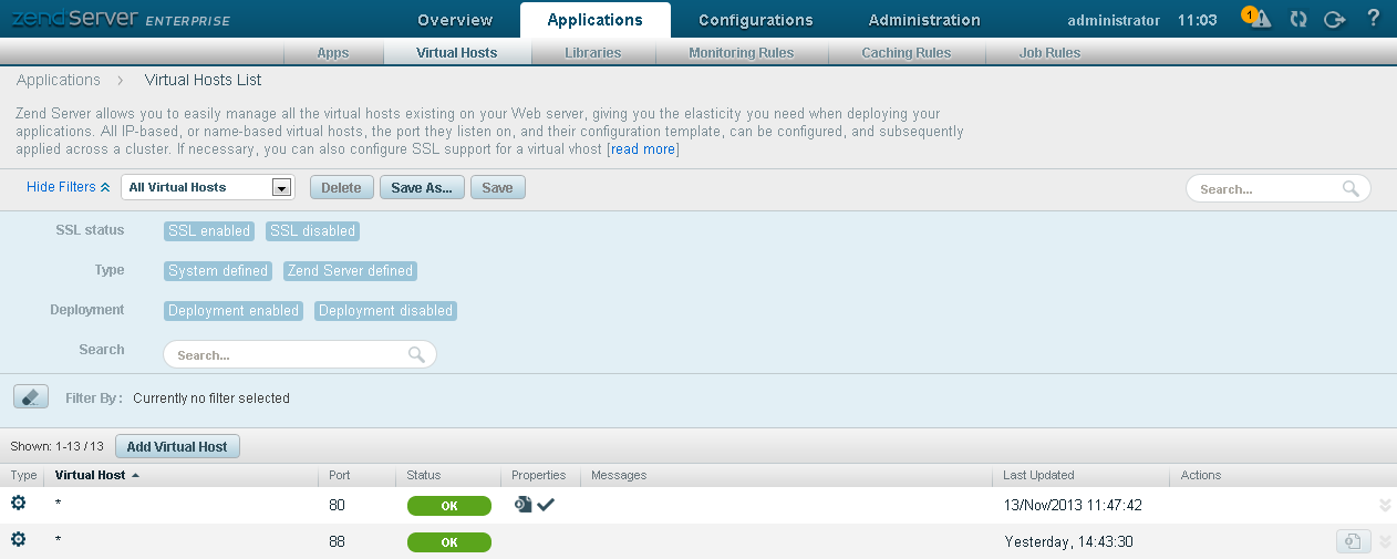 This topic describes how to manage virtual hosts on Zend Server. For more general information on deployment and virtual hosts, see Deployment.