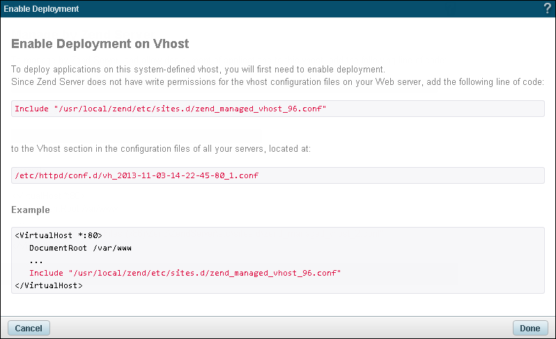 Applications can only be deployed on virtual hosts managed by Zend Server. Deployment to a system-defined virtual host can only be performed once deployment is enabled. For more information, see Enabling Deployment below.