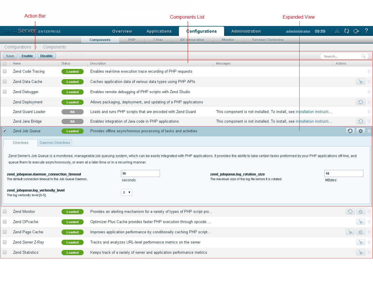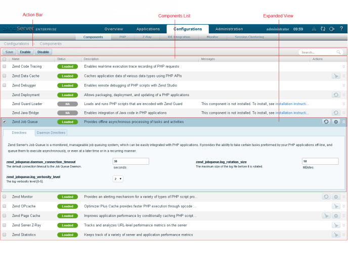 The Components page is accessed from Configurations | Components and is used to view and configure the Zend Components installed and enabled in your environment.