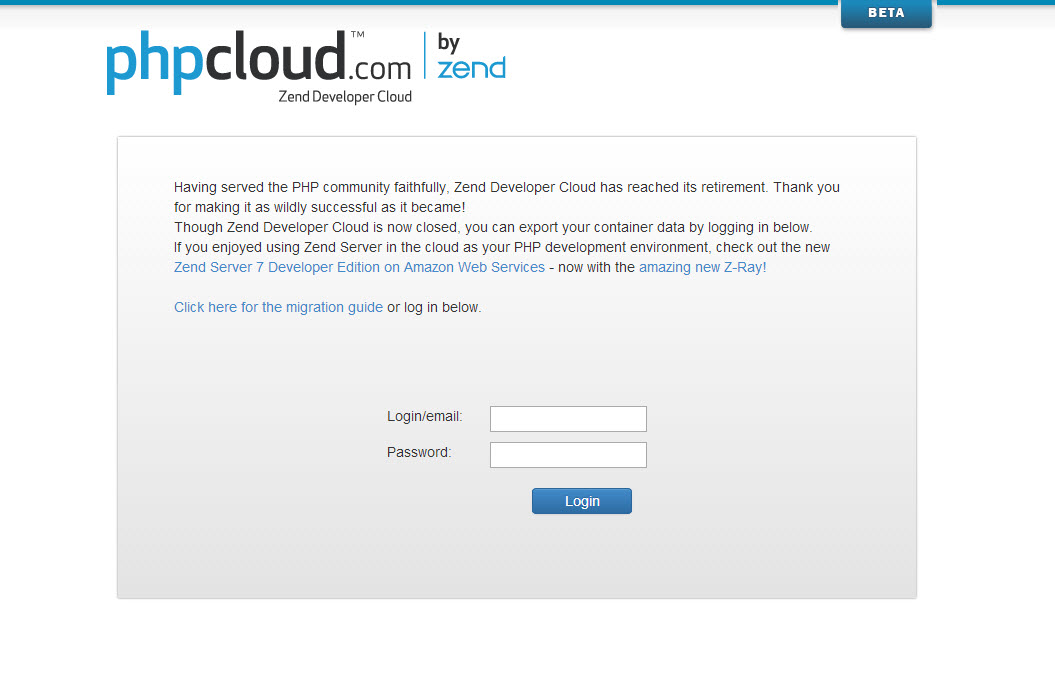 Having served the PHP community faithfully, the Zend Developer Cloud has reached ITS retirement and is about to be discontinued. As an alternative, we suggest you move your development environment to AWS by trying the Zend Server 7 Developer Edition Amazon Machine Image (AMI).