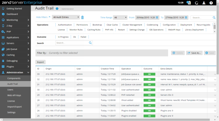 Zend Server 's Audit Trail feature is a simple yet effective method for tracking UI/API user activity, and is especially useful in large-scaled and distributed enterprises. Any time a user performs a significant activity, a record indicating what happened and when it happened is audited and logged by Zend Server. An example for such an activity would be a user deploying an application (for a full list of audited activities , see Audited Actions). The audit log will display information on this activity, such as the name of the user deploying the application and the outcome of the deployment process.