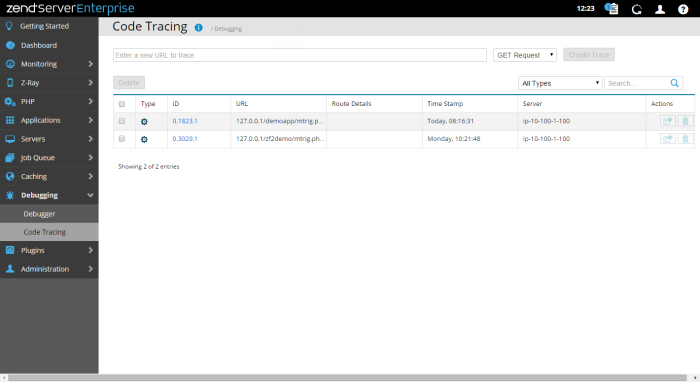 Filter drop- down menu: Triggered by Code - Show traces that were triggered by executed script. Triggered by Event - Show traces that were triggered by a monitoring rule. Manual Request - Show traces that were triggered by manually-entered URLs . Triggered by Segfault- A trace triggered by a PHP Error. |