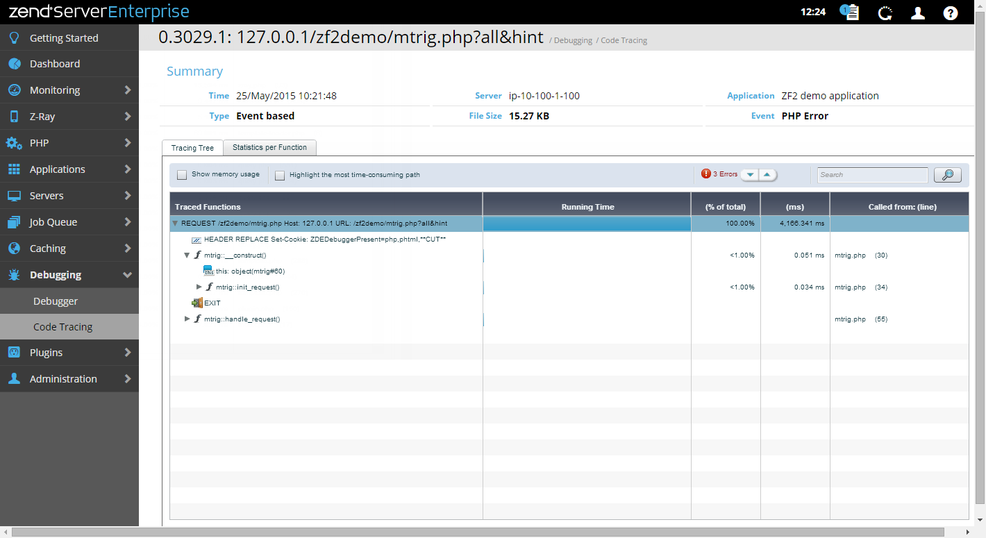 The Code Tracing Details page is displayed when selecting a trace from the Code Traces list on the Code Tracing page, and includes all available trace information, including the Code Tracing Tree and Statistics per Function tables.