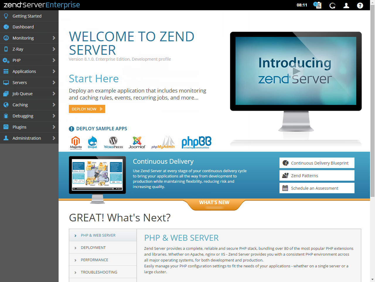 Once launched, you have full access to all Zend Server features for a period of 30 days. The Getting Started tutorial will help you get started with some of these features. Our next step is to deploy one of the demo applications Zend Server supplies - WordPress.
