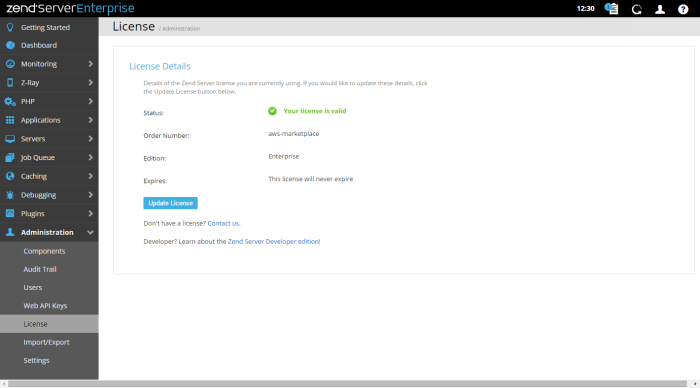 The License page is accessed from Administration | License, and is used to display, or update, the Zend Server license details.