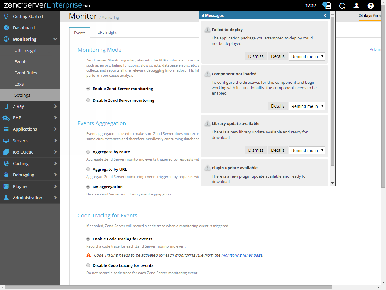 The Zend Server Notification Center is a notification system for viewing live alerts in your working environment, and is a useful tool for staying up to date with existing issues or errors, and required actions that need to be performed in your working environment. For a full list of notifications, see Notifications.