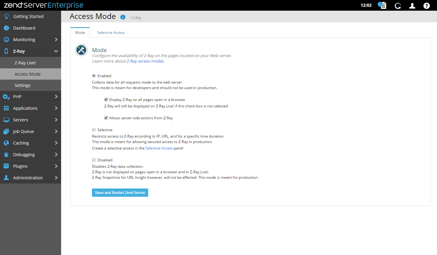 Selective Mode - enables Z-Ray selective access mode, restricts access to Z-Ray according to IP, URL, and for a specific time duration. - Disabled Mode - disables Z-Ray on all pages on your web server.