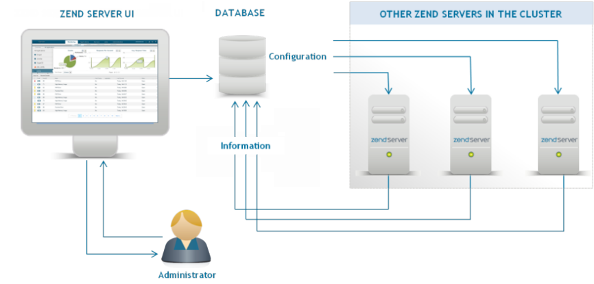 The Zend Server UI interacts with the database via the Zend Server daemon (ZSD), changing configurations and issuing commands, and can be located on any one of the servers in the cluster, or even on separate servers.