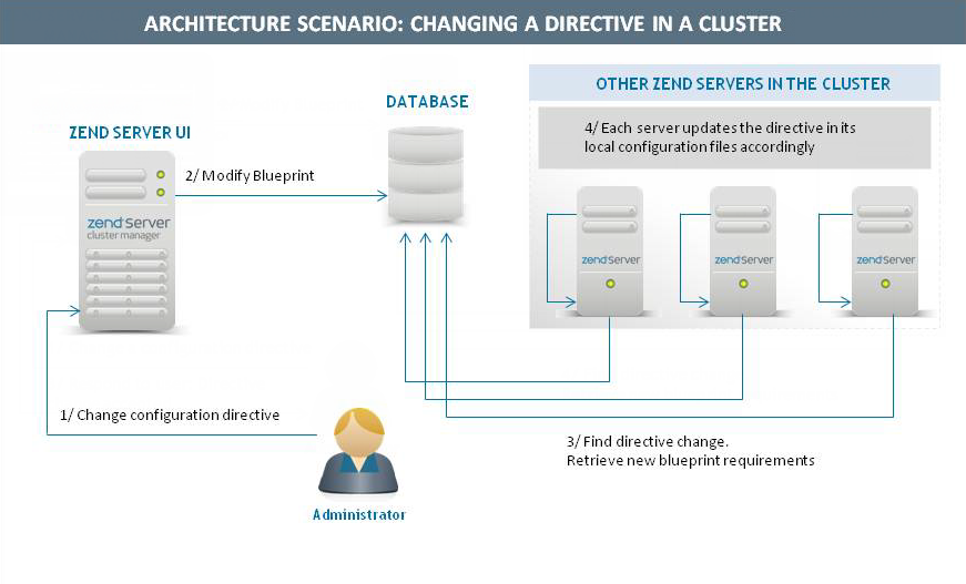 To illustrate how the Zend Server architecture works in a cluster, the following diagram simulates the process of changing a directive from the Zend Server UI: