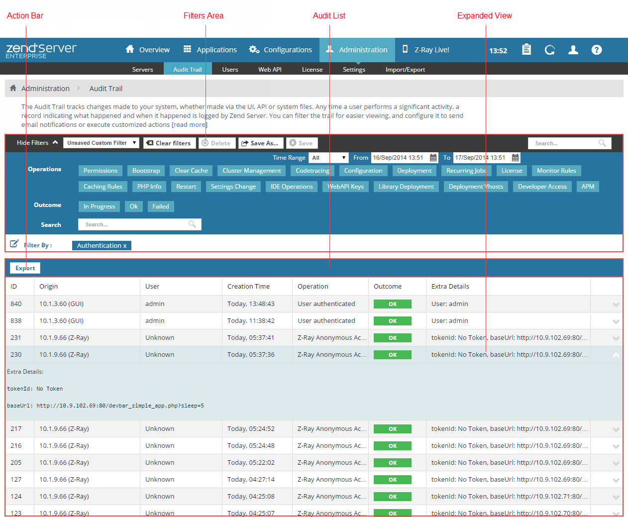 The Audit Trail page is accessed from Administration | Audit Trail, and is the default page for the Administration tab. The page is used to view the latest audited user activities taking place in your working environment, and to configure their settings.