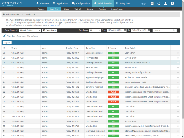 Zend Server 's Audit Trail feature is a simple yet effective method for tracking UI/API user activity, and is especially useful in large-scaled and distributed enterprises. Any time a user performs a significant activity, a record indicating what happened and when it happened is audited and logged by Zend Server. An example for such an activity would be a user deploying an application (for a full list of audited activities , see Audited Actions). The audit log will display information on this activity, such as the name of the user deploying the application and the outcome of the deployment process.