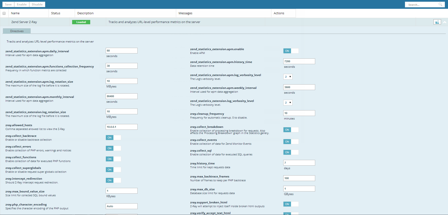 For a list of the available directives, see Zend Server Z-Ray - Configuration Directives.